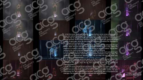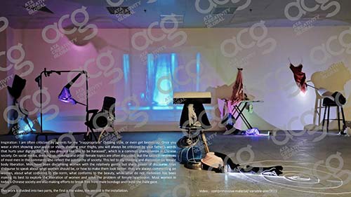 此作品的创作持续了半年,因为作品中包含了一个影像,影像主题围绕“舞蹈是人类身体的解放”展开创作。在此之前我从来没有接触过拍摄,所以创作脚本,道具,场地,后期等都是我一个人,因此花费了很长时间,由于每次拍摄都有一些不足,所以拍摄完成后都会制作小样发给老师确认细节,找到不足以后继续尝试拍摄。作品还包含五组装置,利用了影像中的服装与道具和五组关于女性身体解放的国内外知名舞蹈结合起来创作的装置作品。