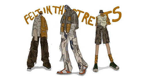Beatrice通过毛毡、拼布和编织的手法,对牛仔布和帆布废料进行升级再造,并使用天然染料印染织物。她的系列旨在跨季节穿着,具有可拆卸的袖子,使穿着者可以轻松穿出多种风格,以避免购买新的衣物。