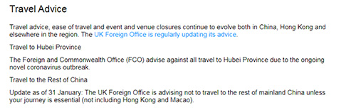 针对新型冠状病毒事宜,UAL官网给出了更具体更细化的4条建议,该4条建议分别针对“直接受此建议影响的人”、“往返过中国的人” “直接受新型冠状病毒影响的人”以及“给中国学生的信息”。
