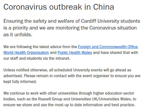 针对新冠状病毒疫情的发展,卡迪夫大学提出遵循相关国际组织建议,针对过去14天去过湖北的学生和教职工,学校建议待在室内,不要自行去医院。