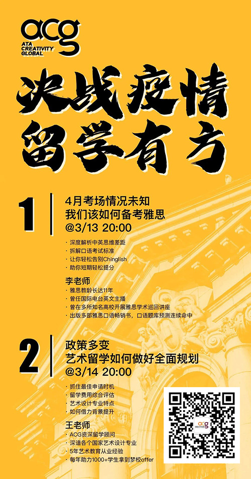 针对艺术留学各重镇国针对中国疫情作出了一些政策变化,ACG国际艺术教育&朗阁英语联合为大家开展了两场线上讲座,这为大家整理了各国最新政策并加以解读,并且针对下一个申请季的规划问题为大家出谋划策。